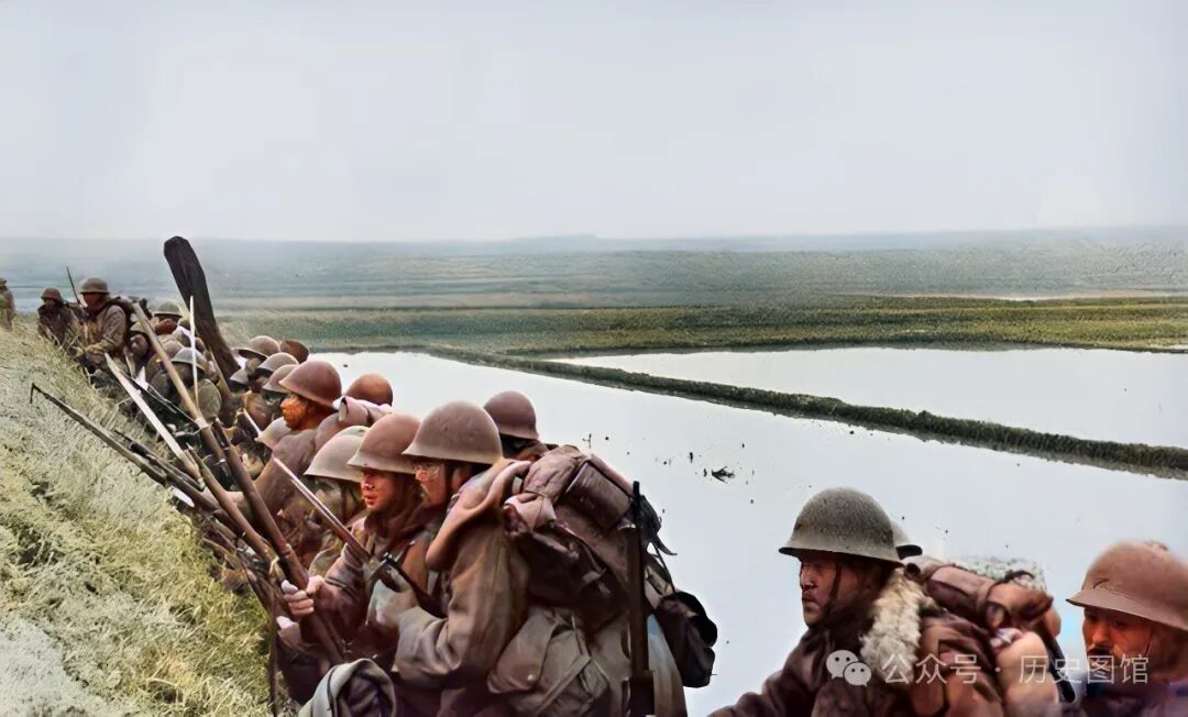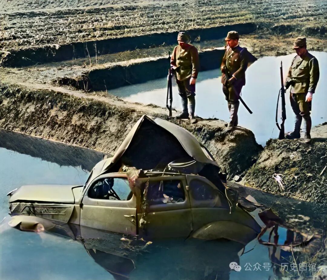 1938年,在安徽城外的水塘边。一名日本军官和两名士兵,看着水里一辆被炸毁的日军军车。这辆日军军车,被中国军队埋设的地雷炸坏,后又被推进了水塘里。看到这一幕,真是太解气了!