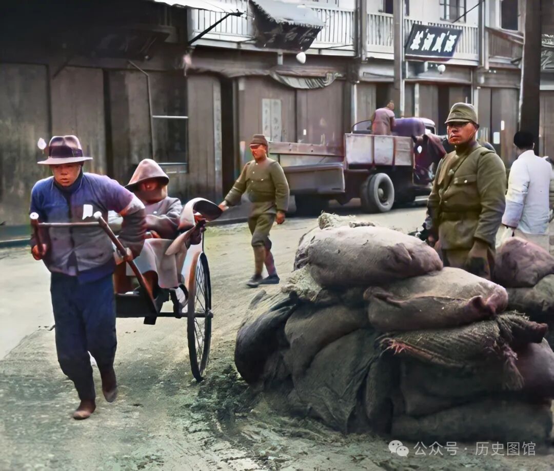 1938年2月,在安徽芜湖城内的一条街道边,日军在这里用沙袋建起掩体,一名日军站在沙袋后面站岗。一名拉车的人力车夫,急匆匆地从日军掩体前经过。坐在车上的乘客,更是把帽檐压得低低的。