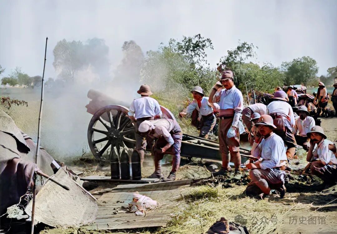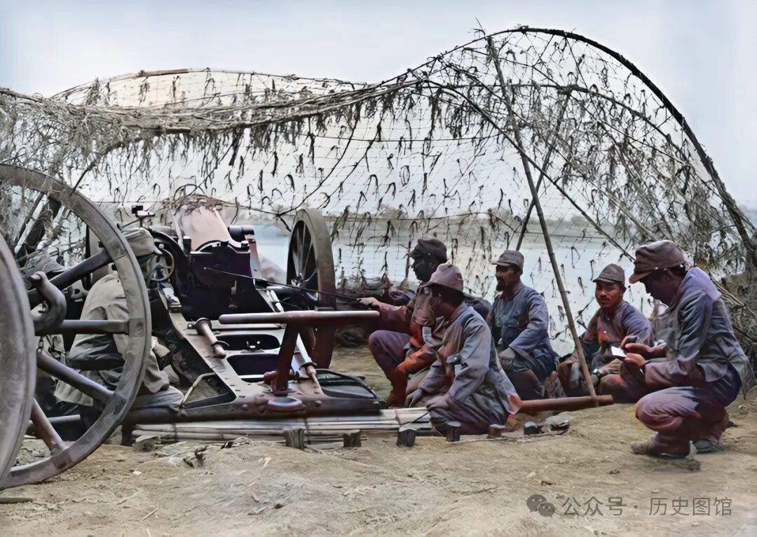 1938年4月,津浦线安徽蚌埠。日军在淮河岸边,建立起了炮兵阵地,为了不被发现,还搭起了伪装网。大炮的炮口指向中国军队的阵地。这些日军,隶属于日军富田部队。