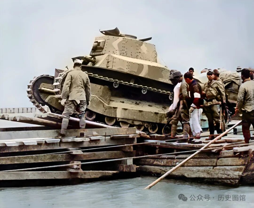 1938年4月,日军在淮河上,用木船搭起简易桥梁,将坦克车运进怀远。这支渡河的日军,隶属于日军岩仲部队。仔细看,站在木桥上的日军里,还有一名胳膊上戴着白袖章的中国人,真是让人意想不到。