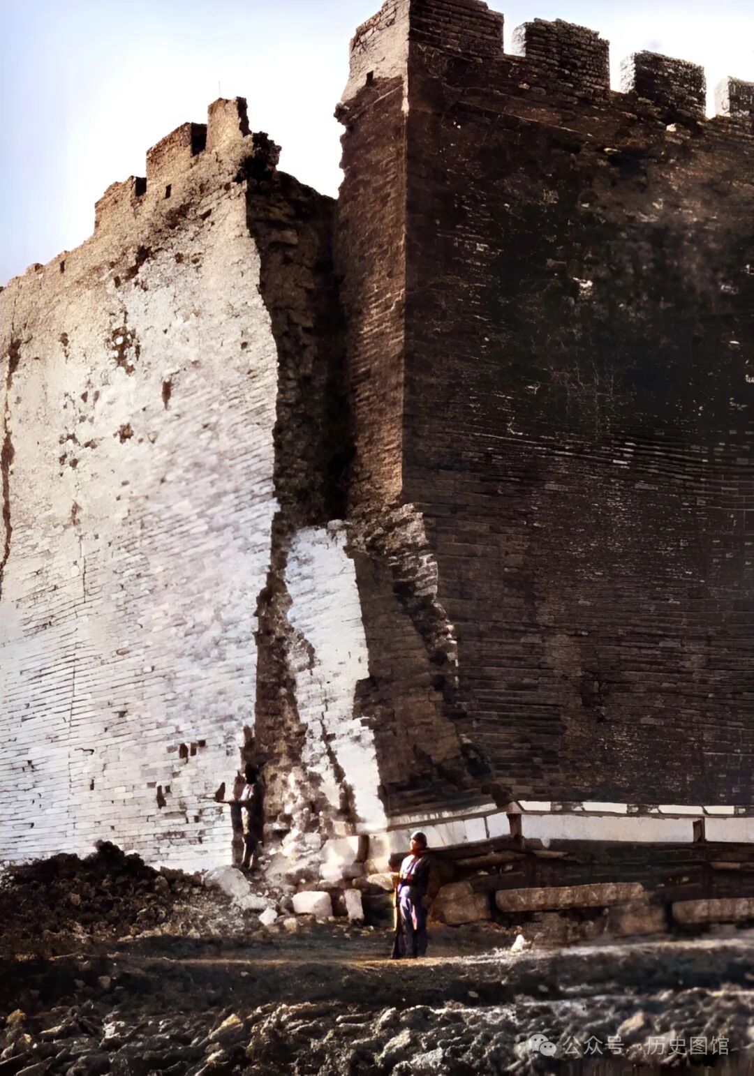 1938年2月,安徽凤阳城景象。照片里的凤阳城墙,高大壮观。墙壁上却布满了弹孔,城墙的一角也被日军炸塌。一名日军士兵拿着枪,站在城墙下的马路上放哨。