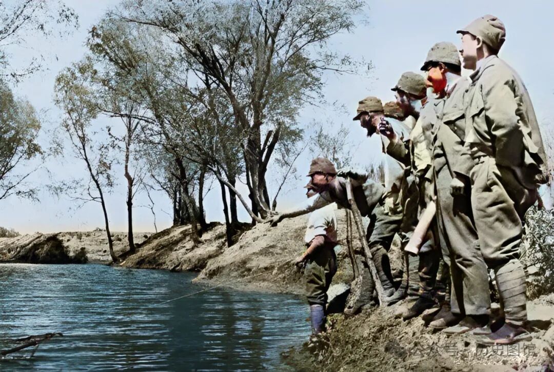 1938年3月,安徽蚌埠。一名日军拿着从中国老百姓手里抢来的渔网,在河边撒网捕鱼。另外几名同伴,站在湖边指点。日军把自己的快乐建立在别人的痛苦之上,这场面看了让人憎恶。
