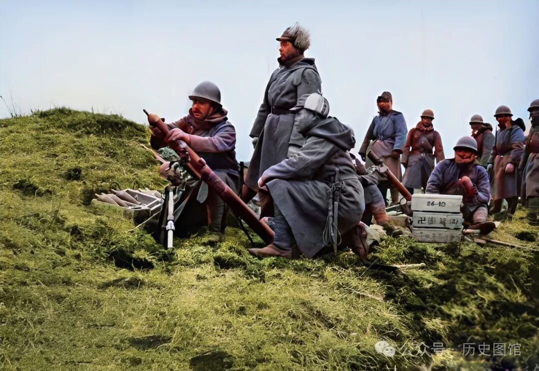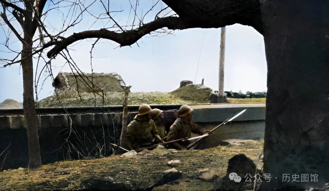 1938年2月,在位于安徽宣城以西的团山镇的一处高地上,日军藤村炮兵部队士兵正在构建炮兵阵地,并朝中国军队阵地进行炮击。近处的地面上,支着一些三八大盖”步枪。