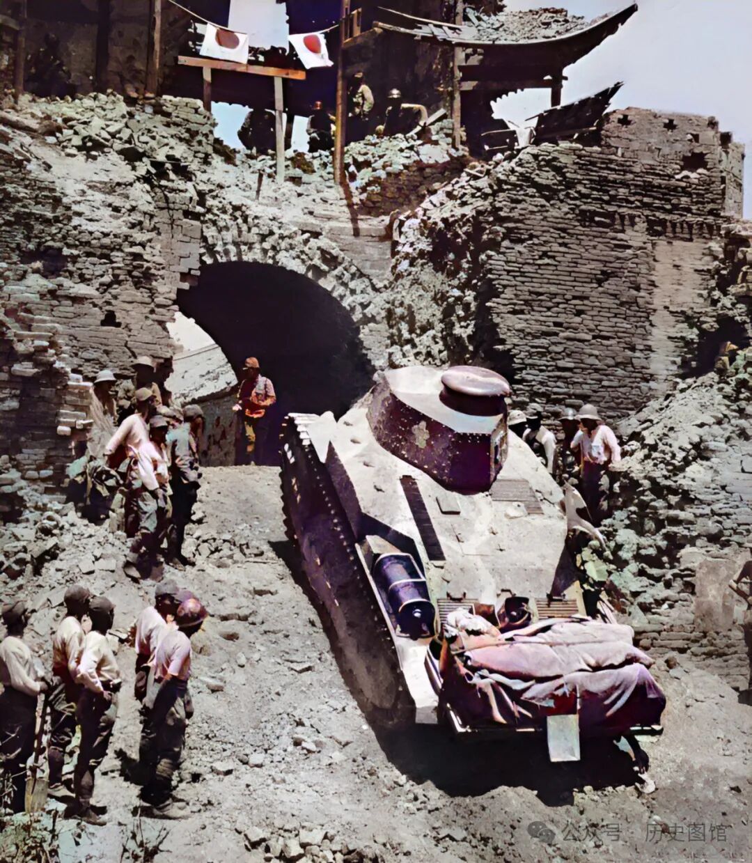 这张照片,记录了日军占领蒙城后景象。高大坚固的城墙被炸塌,城楼损毁严重,露出了里面的立柱和横梁。日军岩仲战车部队坦克正开进城中。