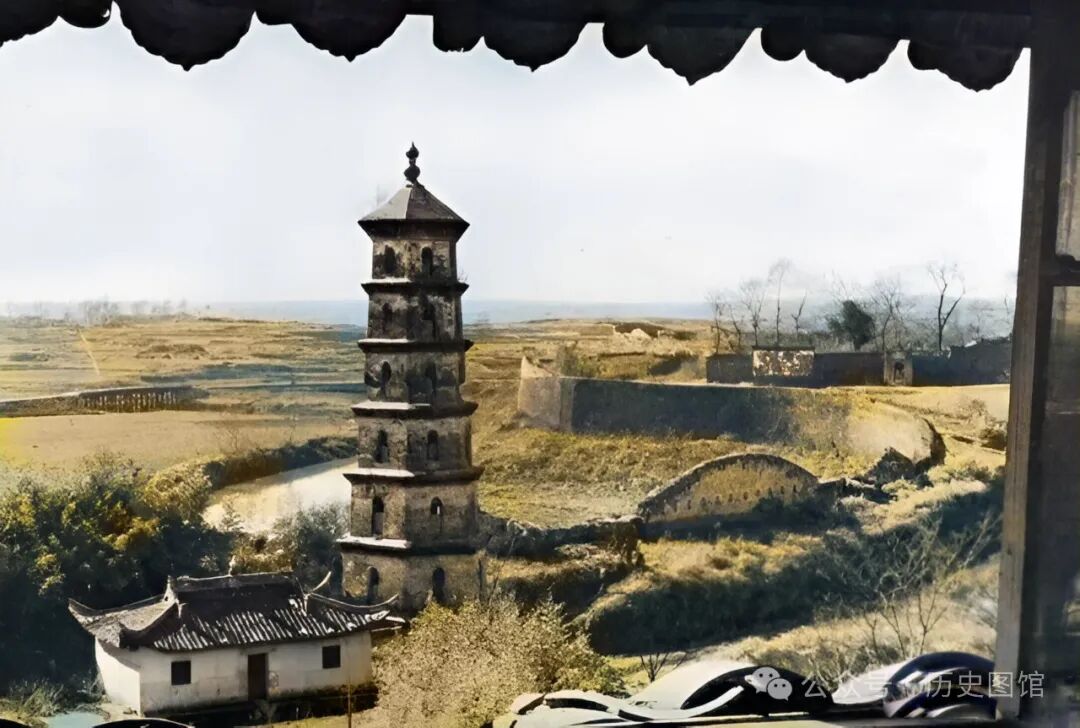 1938年2月,安徽宣城。照片中矗立的古塔,是著名的龙首塔。龙首塔,前方是中国军队阵地。日军攻打宣城时,对城区进行了轰炸,龙首塔屹立不倒。