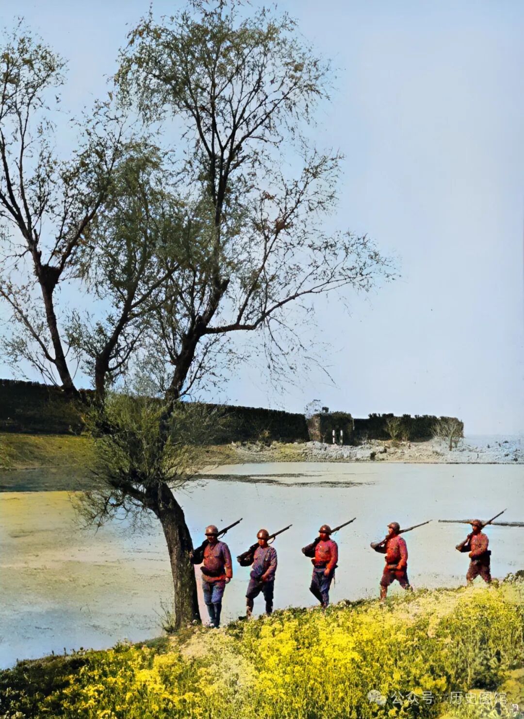1938年3月,五名日军扛着枪,在河边巡逻。河对岸,就是安徽定远城的城墙。1938年1月,定远失守,日军占领了这里。沿河边巡逻的,是日军增田部队的士兵。