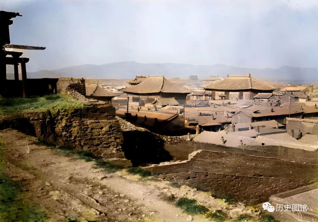 这张近景照片,是站在城楼上拍摄的。更能直观地看到当时大同城内的民居建筑。房屋属于北方典型的瓦房格局,四合院一座挨着一座,粉墙黛瓦。房顶上为何矗立着很多小烟囱?不要奇怪,山西的冬天很冷,每家都要烧炕取暖御寒。
