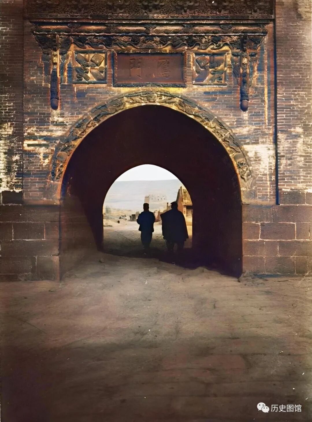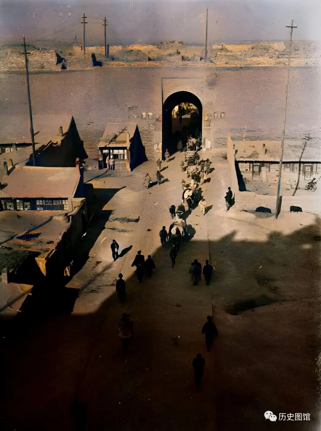 这张照片拍摄于1937年,大同一座城门口的景象。城门上方城楼已经消失不见了,却载着几根电线杆。城外的人们正通过城门进入城内。有的赶着骡马,有的步行。城门前两侧,还有一些低矮的民房以及院落。80多年前的大同城,让人印象深刻。