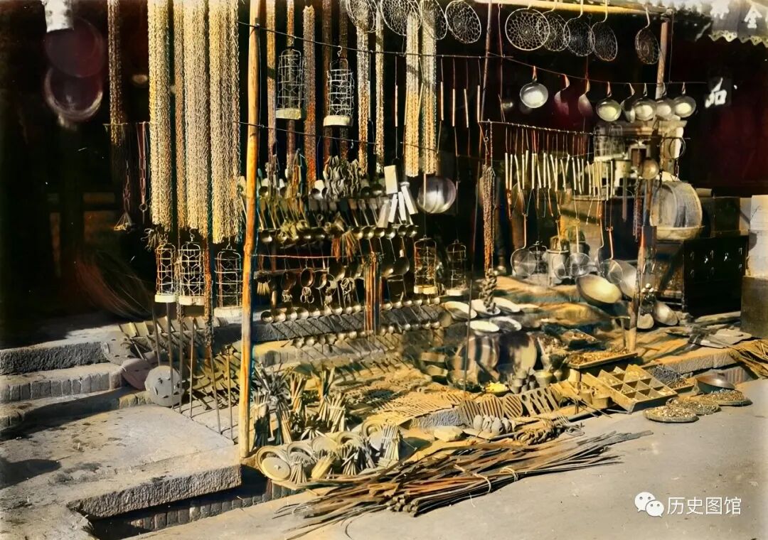 这是大同街头一间五金店,店门口摆放着很多铁制的器物,有勺子、笊篱、农具等。可见当时的小商品种类繁多。如果不注明,谁能想到这是80多年前的大同街头场景,就是现在一些小集镇上也还能看到。