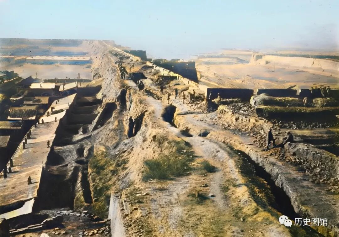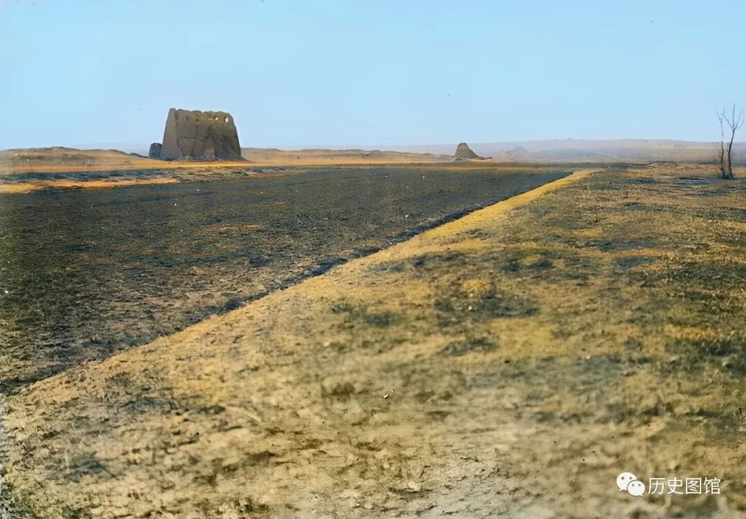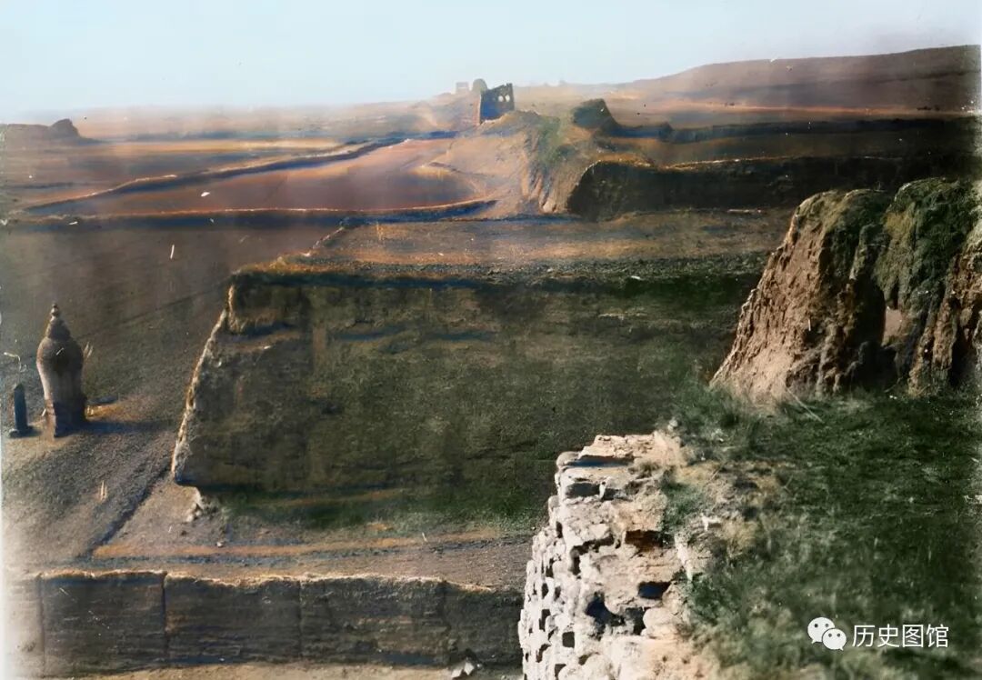 这张照片拍摄于1937年,这是一段古长城的遗址。历经千年的风吹雨打,城墙风化严重,土墙坍塌,但还能看到部分的砖石结构。远处一些凸起部分,很有可能就是当年城墙上的烽火台遗迹。