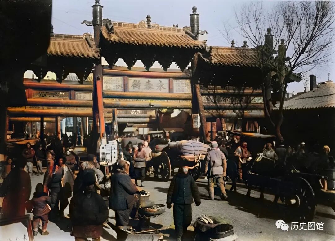 大同的四牌楼很有名,可以说是过去的网红打卡地。由四座明代中期修建的木制大牌坊组成,规模很大,周边交通十分便利,商业繁华。照片中是其中一座牌楼,上面写着“永泰街”。牌楼附近人来人往,赶马车的、做生意的、逛街的,好不热闹。