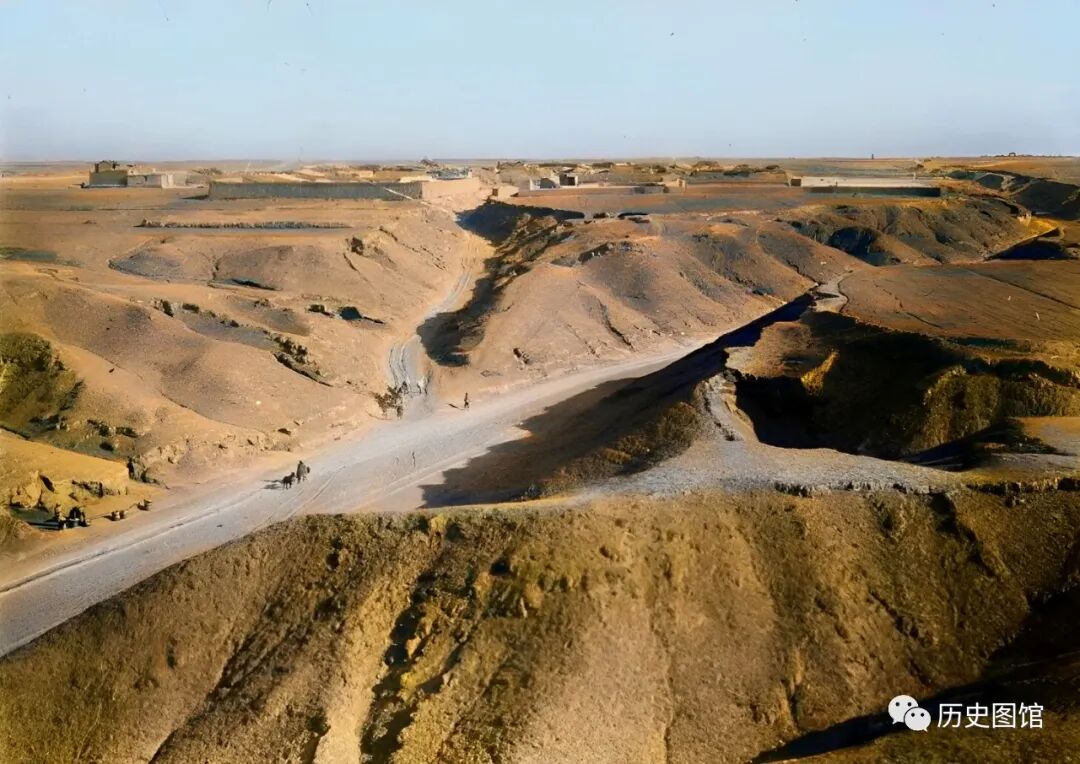 这是当时大同城一段城墙,由于常年的雨水侵蚀和地基变化,城墙从中间裂开了,但依然不影响行人从上面通过,两条前沿曲折的小路就是最好的证明。城墙内外,景象各不相同,里面是成排的民居,外面是一望无际的黄土地。