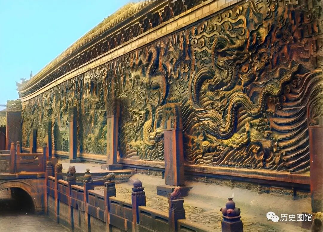 这就是著名的“九龙壁”,壁高8米,厚2.02米,长45.5米。始建于明代洪武二十五年(1392年), 是明太祖朱元璋第十三子朱桂代王府邸前照壁,距今已有600多年的历史。九条金龙腾云驾雾,栩栩如生,贵气十足。