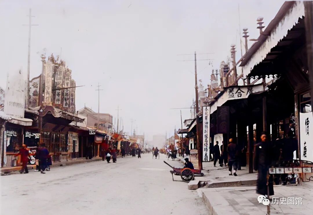 这是1939年的大同城街道面貌。街道平坦笔直,一眼望不到头。街道两旁的建筑,高低错落,古色古香,沿街店铺的广告牌子琳琅满目,一些行人正在逛街,有的人还穿着长衫,很有年代感。