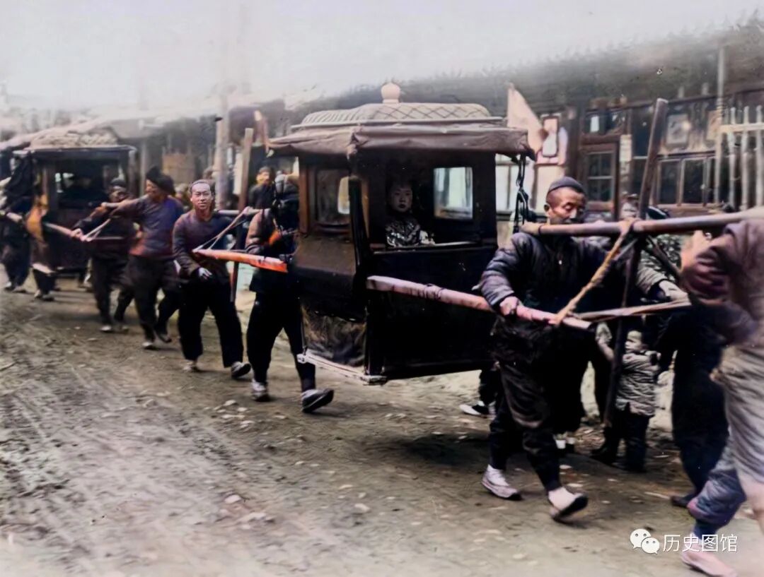 这是大同当地人娶媳妇的场景,轿夫抬起轿子健步如飞,轿中有一位端庄贤淑的新娘子,凤冠霞帔,真漂亮!一看就不是平常人家的。引得路人纷纷驻足观看。在30年代,这种传统的婚俗很有意思,图的就是喜庆,也很有年代感。