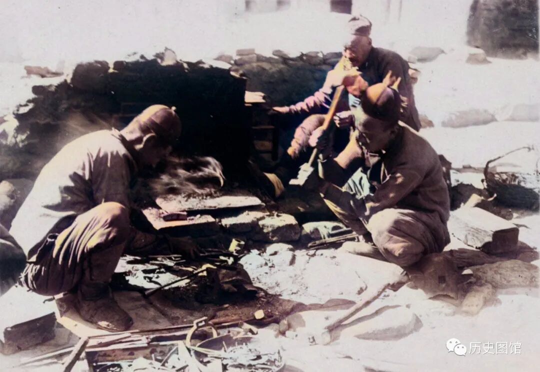 这是一个露天的简易铁匠铺。三名铁匠各司其职,一人烧火,火炉里的煤火烧得正旺。另外两人正在打制一块刚从火炉中取出的铁块。静中有动,似乎能听到锤子敲打在铁块上发出叮叮当当的声音。