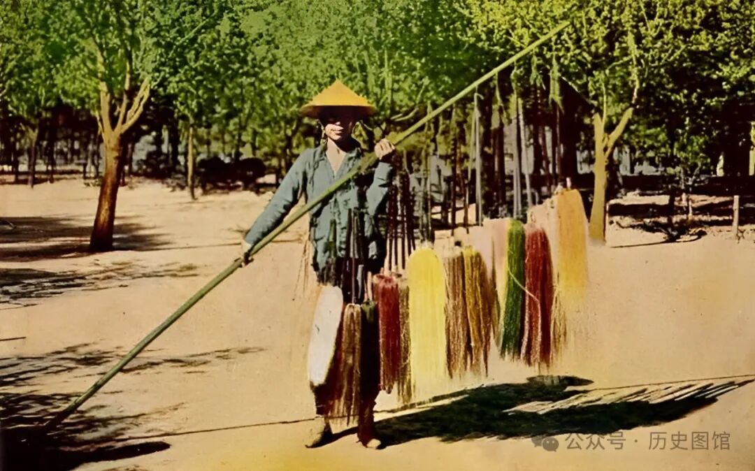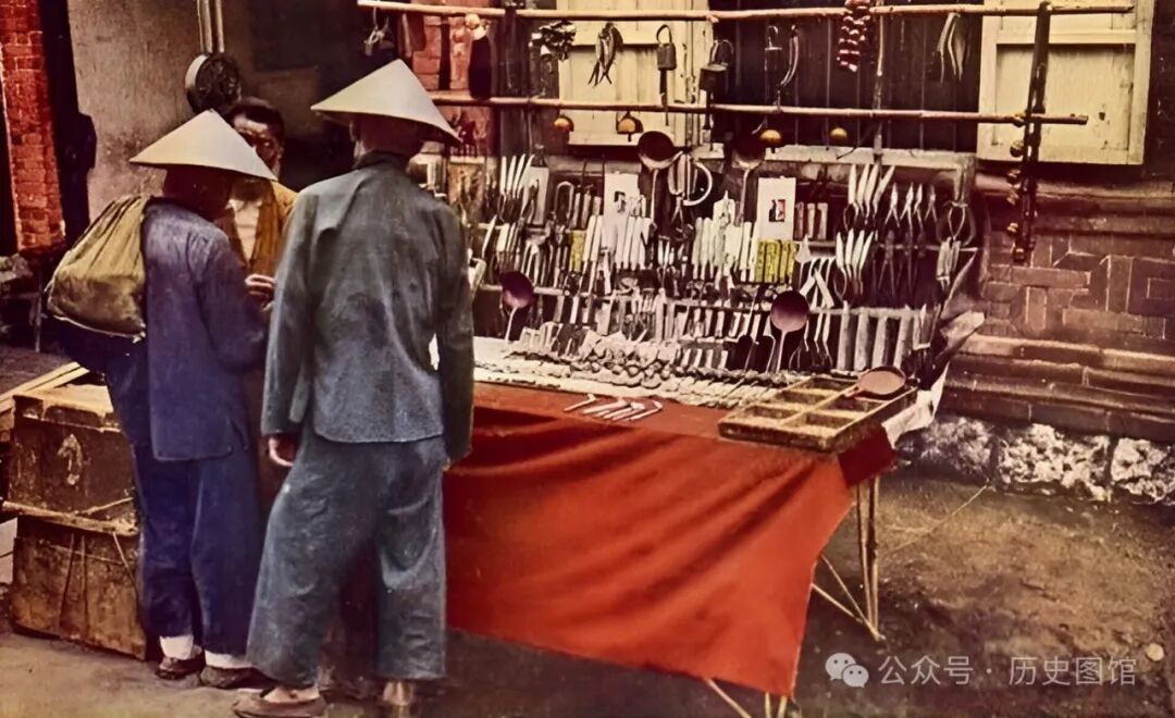 两名戴着斗笠的顾客,站在摊位前选购商品,小贩热情地向他们推荐自己的产品。这样的流动小贩,和现在的街边夜市地摊很相似。