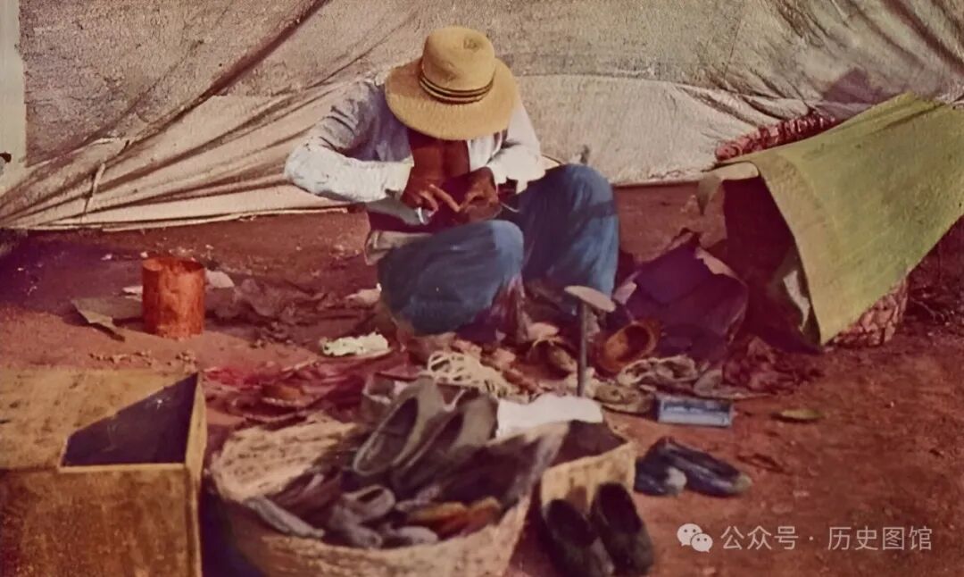 他的摊位很简单,地上摆着修鞋的工具,面前的竹筐里,装着准备修理的鞋子。依靠这门手艺,在那个年代,也能养家糊口。