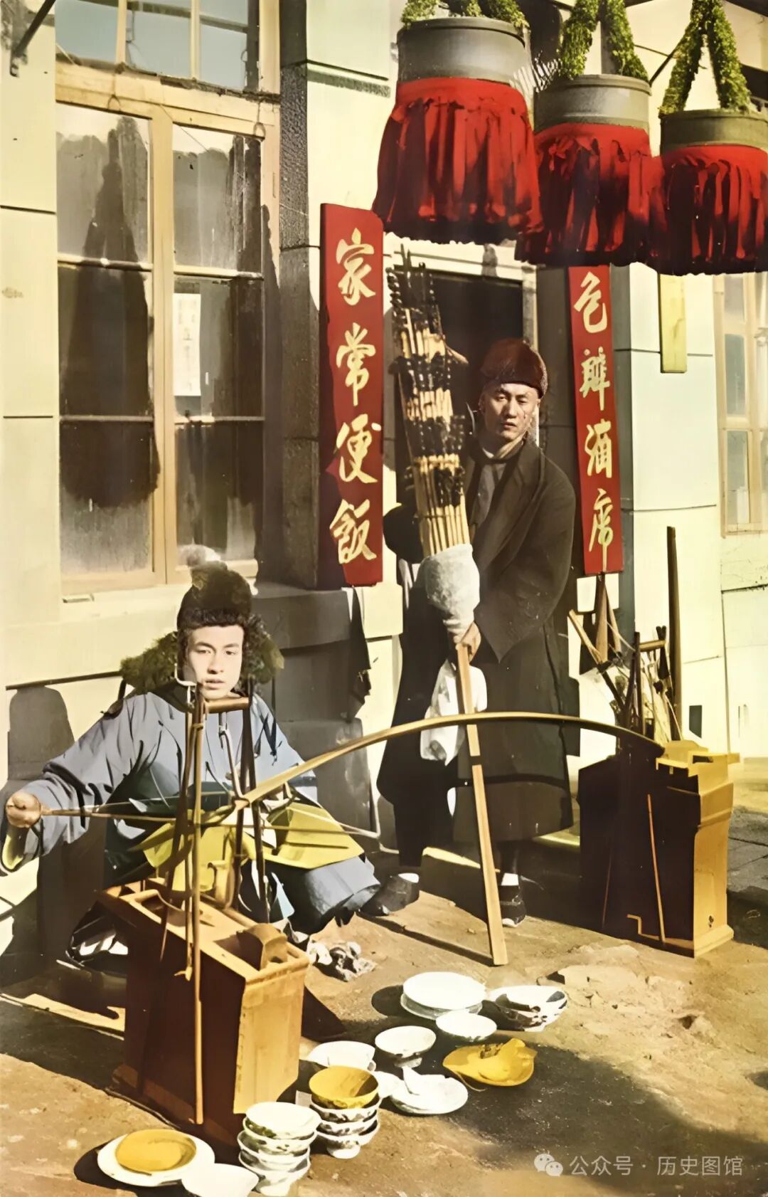 这是90多年前东北的一家饭馆,门口左右贴着“家常便饭,包办酒席”的广告牌。一名锔瓷匠人坐在饭馆门口,正在用传统工艺修复破损的瓷碗、瓷盘。在他身边,站着一名穿大衣的男子,他是卖糖葫芦的小贩。