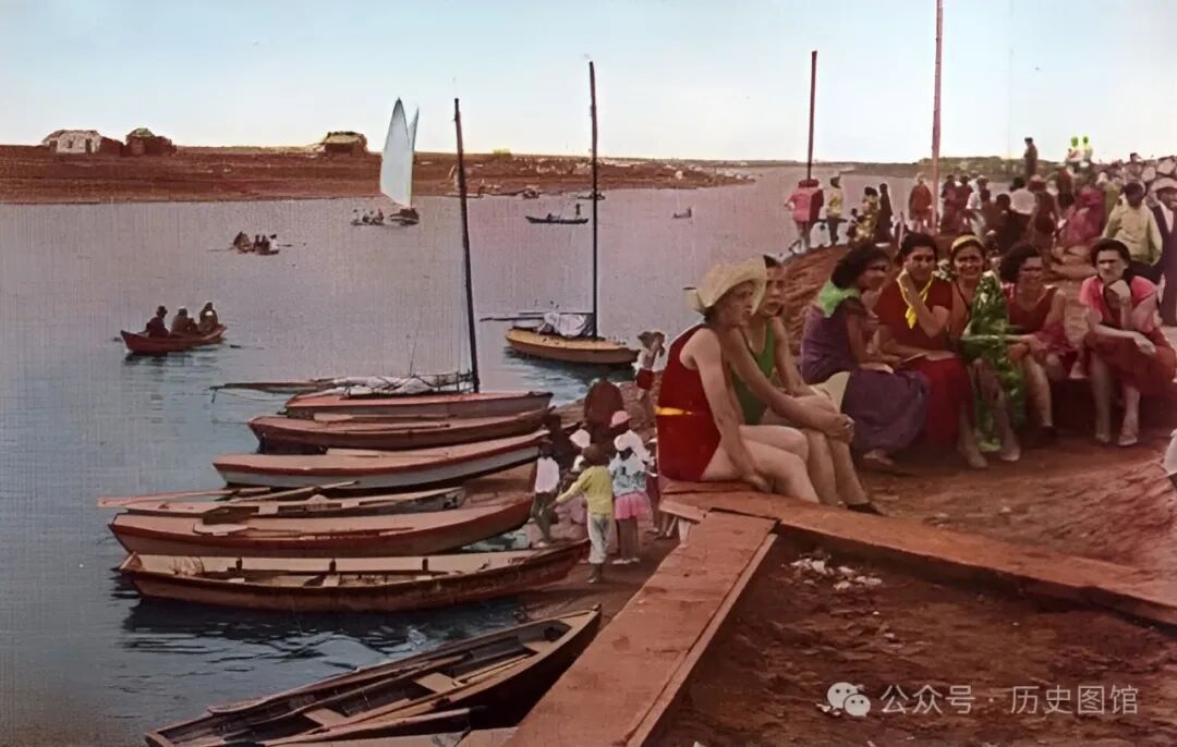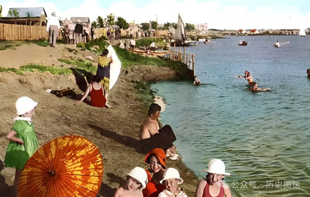 照片中,有不少身穿泳衣的外国女子,在水中游泳。还有人在江中划船,悠闲自得。当时的松花江畔,风光真是古朴又自然,令人流连忘返。