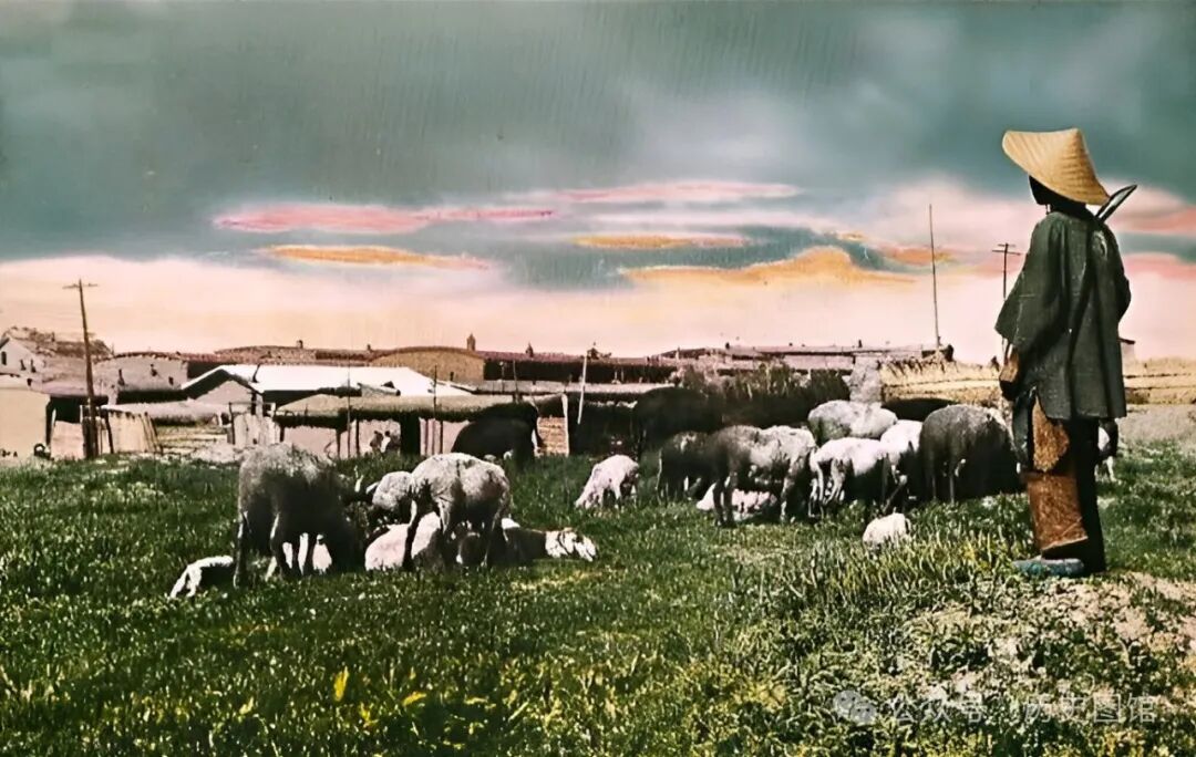 傍晚时分,天边彩霞铺满了天。一名男子赶着一大群羊,在村子外面的草地上放羊。不远处的村子,房屋鳞次栉比,弧形的屋顶上,矗立着很多烟囱。