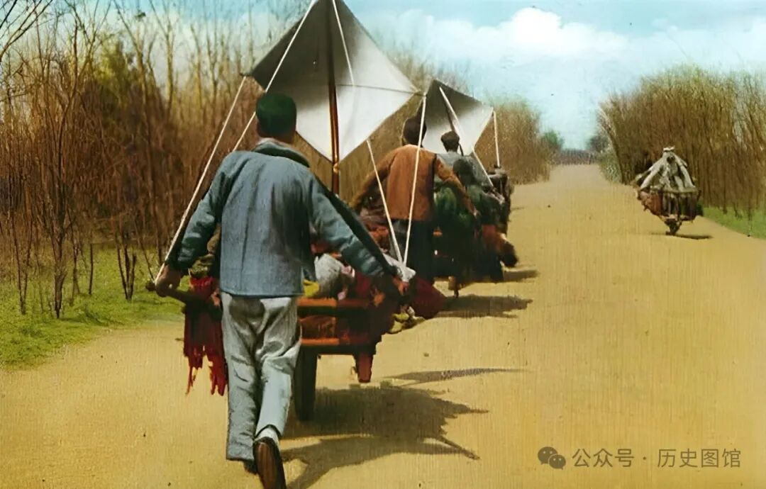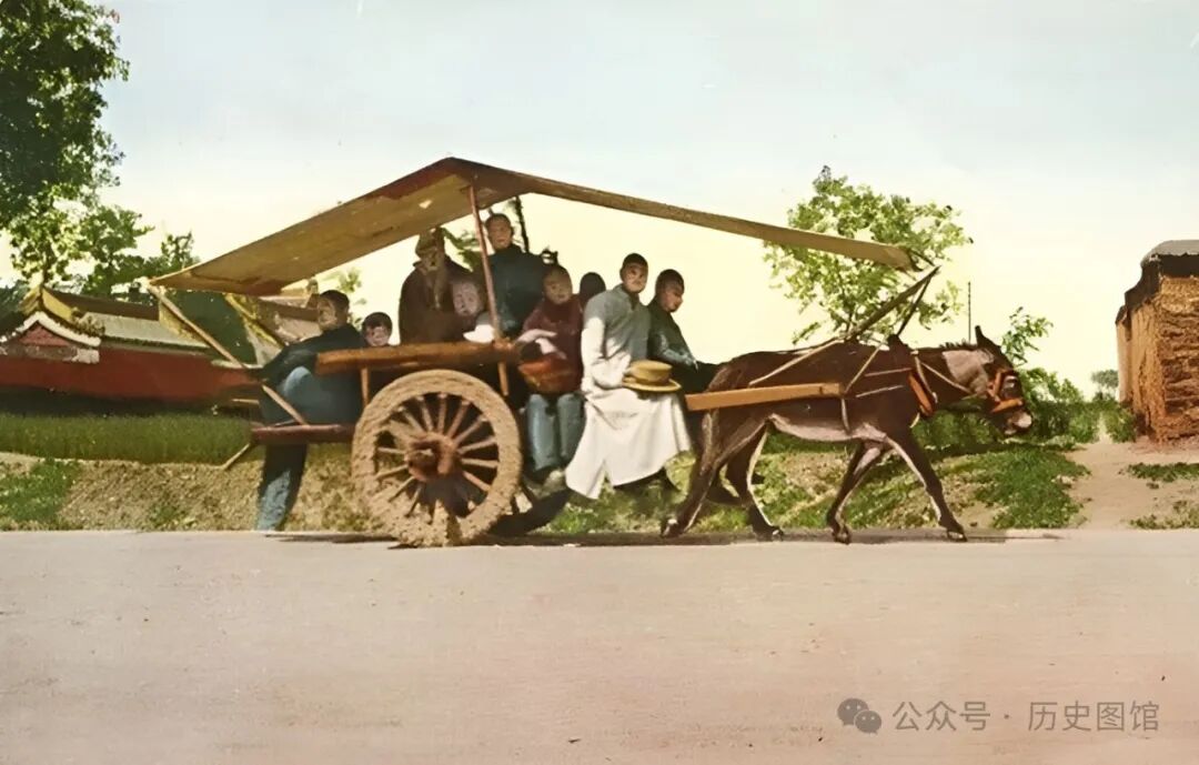 天气炎热,马车上还撑着遮阳棚。在过去的东北,像这样的大马车很常见,也是人们出行的最好选择。