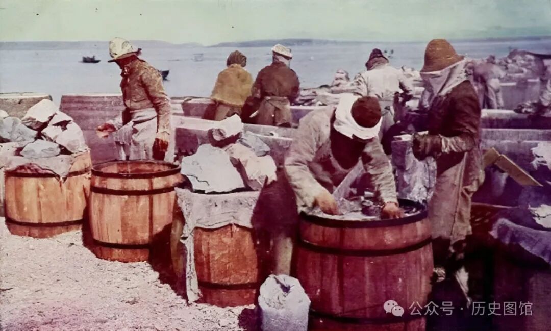 这张照片拍摄于黑龙江口附近,渔民们正在将新鲜的鱼装进木桶里腌制。远处的江面,烟波浩渺,一眼望不到尽头。有渔船在江面上打渔。黑龙江鱼类资源丰富,渔民们收获满满。