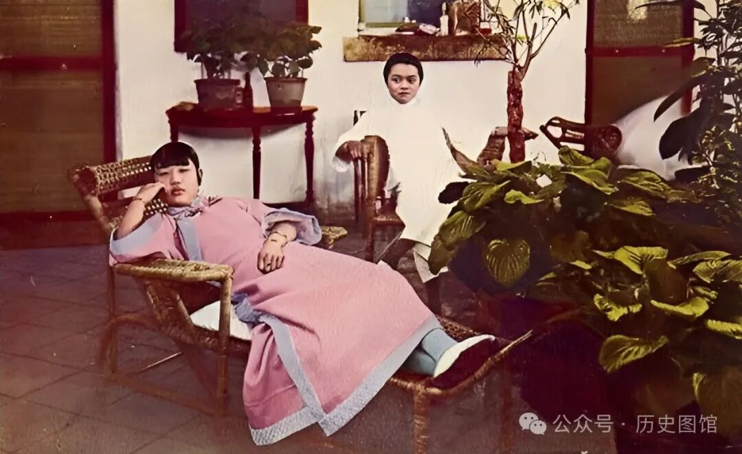 两位大小姐坐在庭院里。她们长相富态,身穿华服,手腕上戴着金饰,正慵懒地躺在竹椅上休息,日子过得真是惬意。