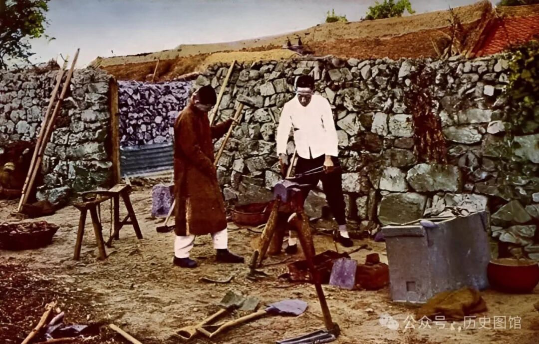 这是一个露天铁匠铺。两名男子正在打铁。打铁也是个技术活,一人抡大锤,一人抡小锤,。选材、生火、加热、锻造、再加热、再锻造……直至成型、淬火。两个人需要配合默契。在过去,学会打铁就等于有了一门吃饭的本事。