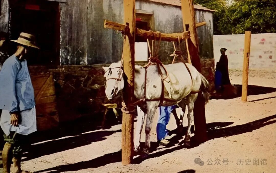 一匹被五花大绑的白马,吊在木架子上,这个行当叫钉马掌,钉马掌是一门技术活。