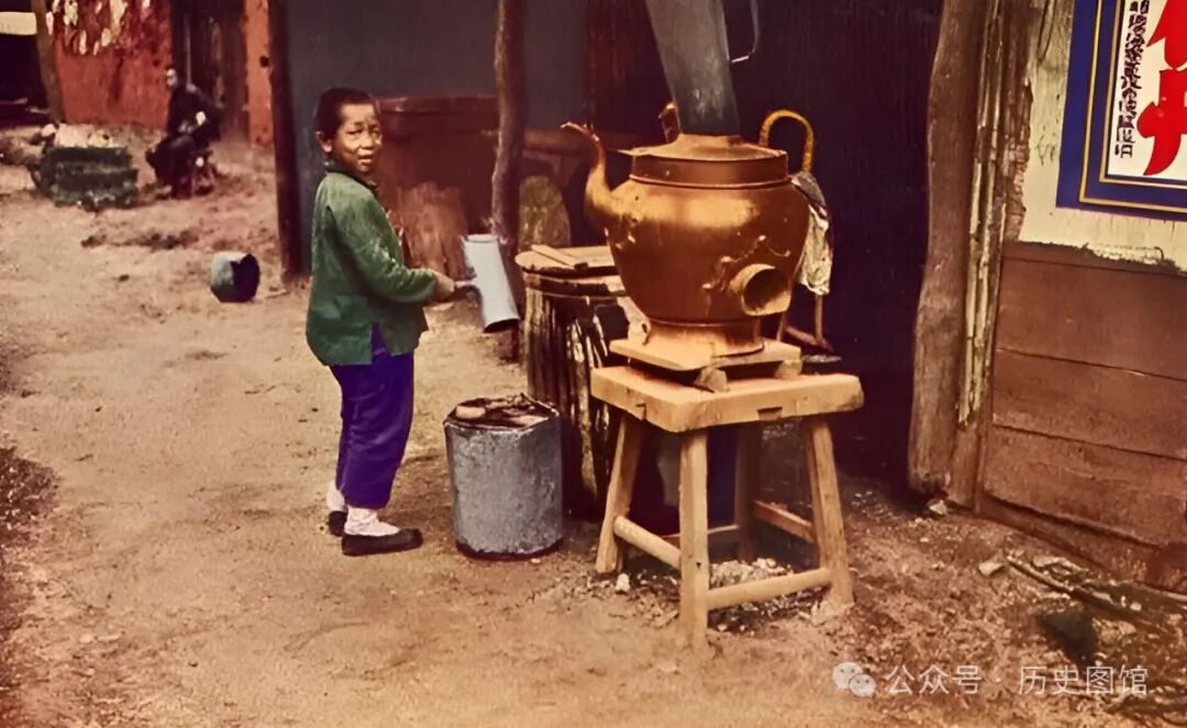 门口的大铜壶里,装满了开水。店家的孩子提着一桶水,正往水缸里倒。看到有人对着他拍照,这个孩子的脸上露出了好奇的表情。