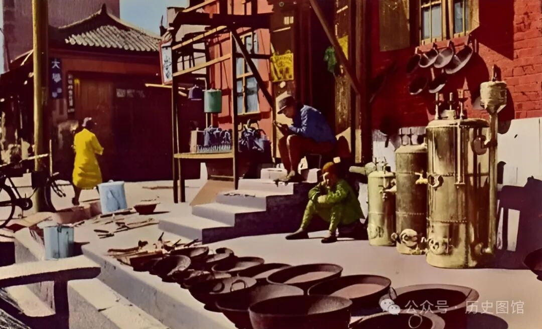 为了招揽生意,店家将商品直接摆在门口展示,各种品类一目了然。当时,没有城管,允许街边摆摊。没生意的时候,日用品店的掌柜悠闲地坐在门口的板凳上晒太阳。