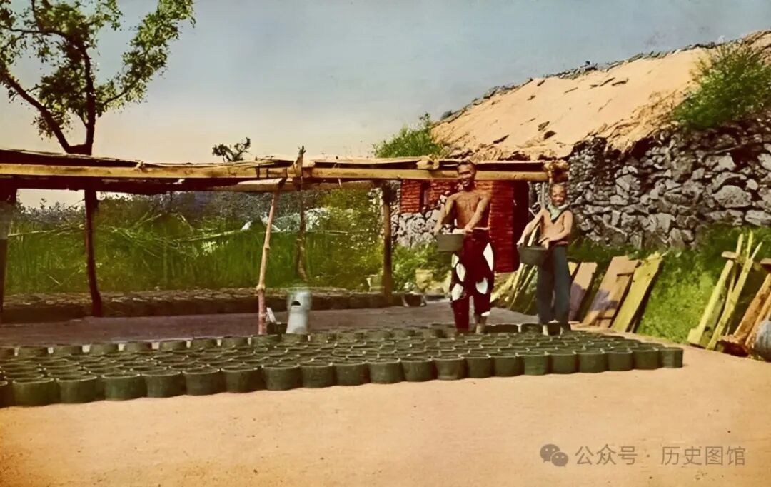 东北地区,一个制作花盆的手工作坊,两名工人,正将制作好的花盆泥坯摆放在平整的场院里晾晒。然后装进窑里烧制。两人都是娴熟的工人,制作的花盆质量很好,销路也不错。两人脸上露出开心的笑容。