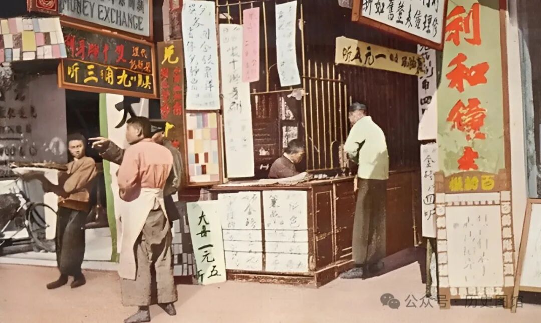 这是当时东北一条街道上的景象。街边店铺是一家钱庄,掌柜坐在柜台里面精打细算。