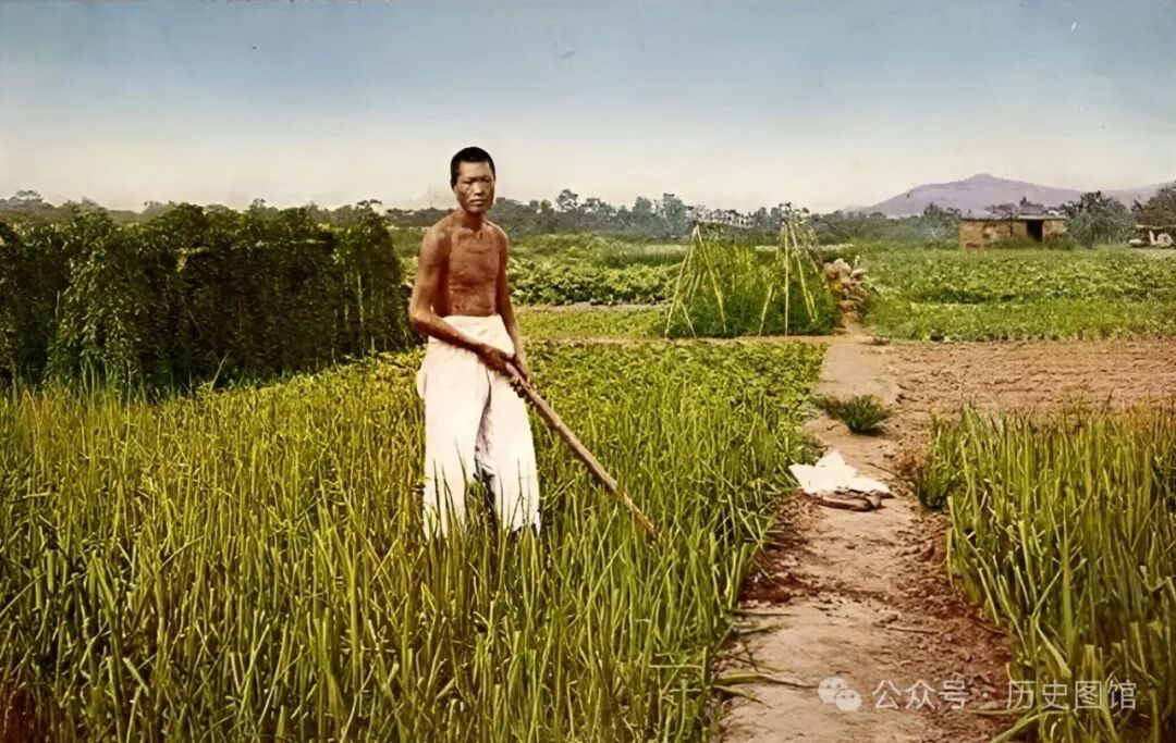一名菜农,正在自家菜园里除草。地里种的看上去像是大蒜,身后不远处,搭起的架子上爬满了豆角。几块菜地里,种植着不同的蔬菜,绿油油的,很新鲜。菜地边上,还有一间房舍。菜农很辛苦,不仅要耕种、管理,还要将菜品挑到街上卖,赚的也是辛苦钱。