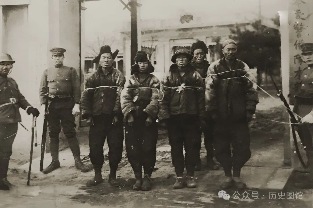 在这张照片中,五位中国俘虏,身上绑着绳子,几名日军站在左右。