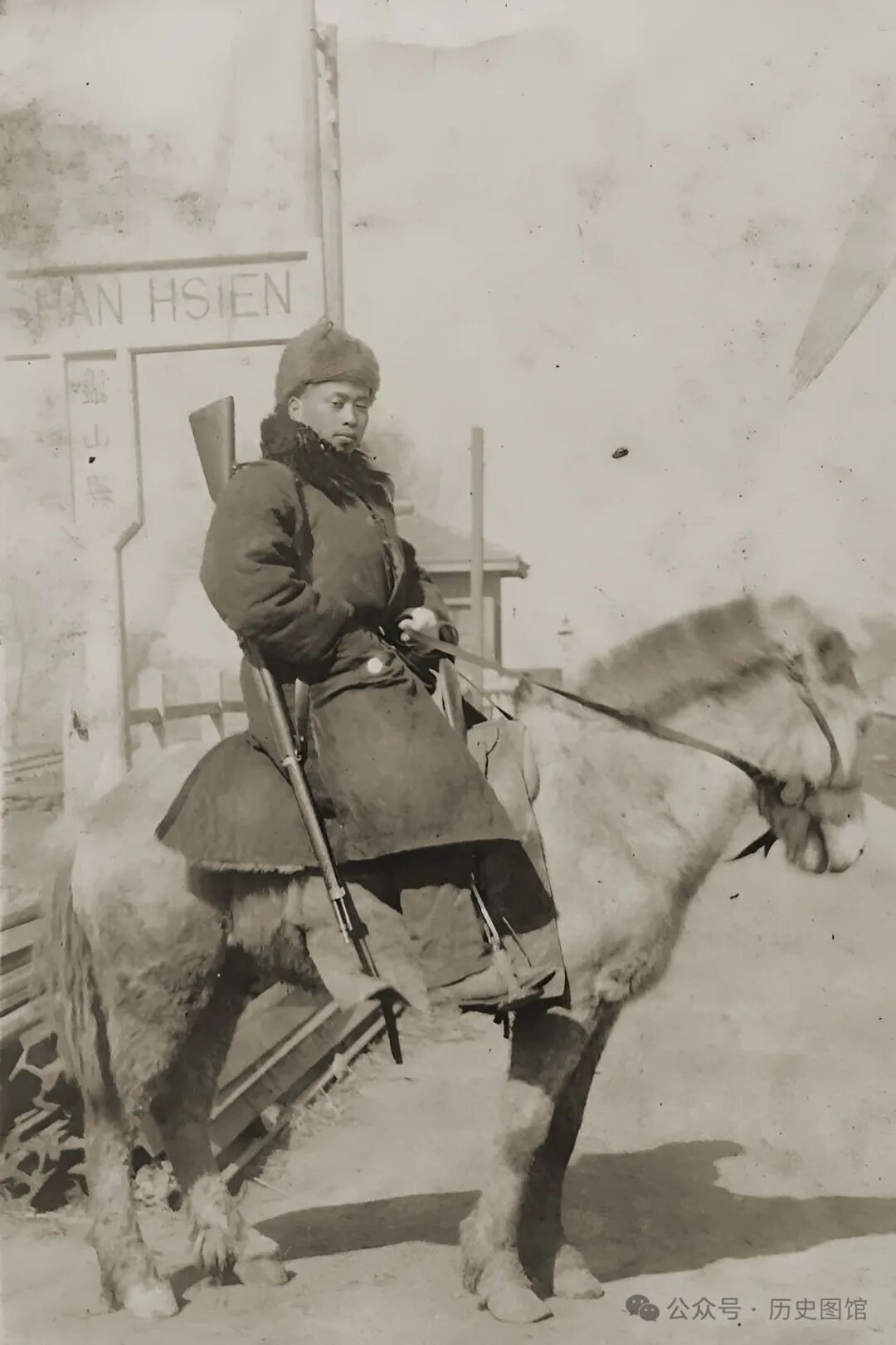 盘山县火车站上,一名日军骑着马背着步枪,站在“盘山县”站牌前,趾高气扬。