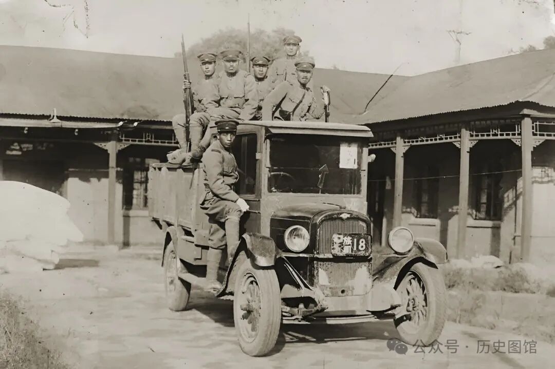 几名日军站在一辆军车上,车头牌子上写着“旅司18”。日军并没有“旅”这个称呼,因此判断这辆军车,很可能属于东北军某个旅级司令部。贴在前车挡风玻璃的纸上,写有“步七八”字样。这应该是相册主人所在的部队名称。