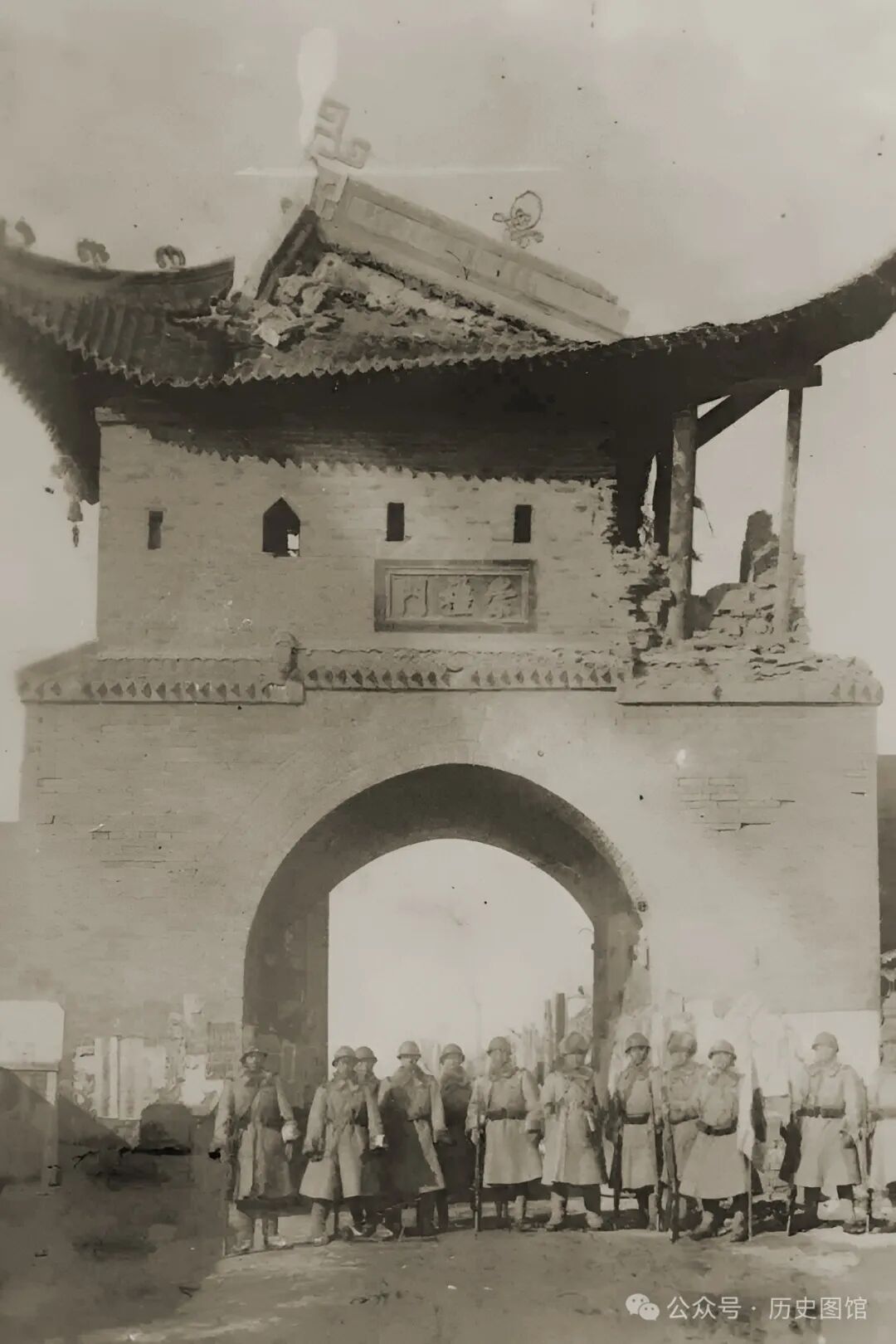 高大的城门楼被炸塌,飞檐断裂,屋顶被日军炮弹炸坏,几乎要掉下来。由于照片比较模糊,无法分辨相册的主人是否也在其中。