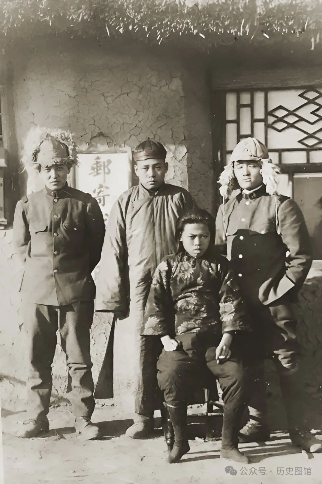 东北某小镇上,在一个邮寄点前,两名日军与当地一对夫妇合影。