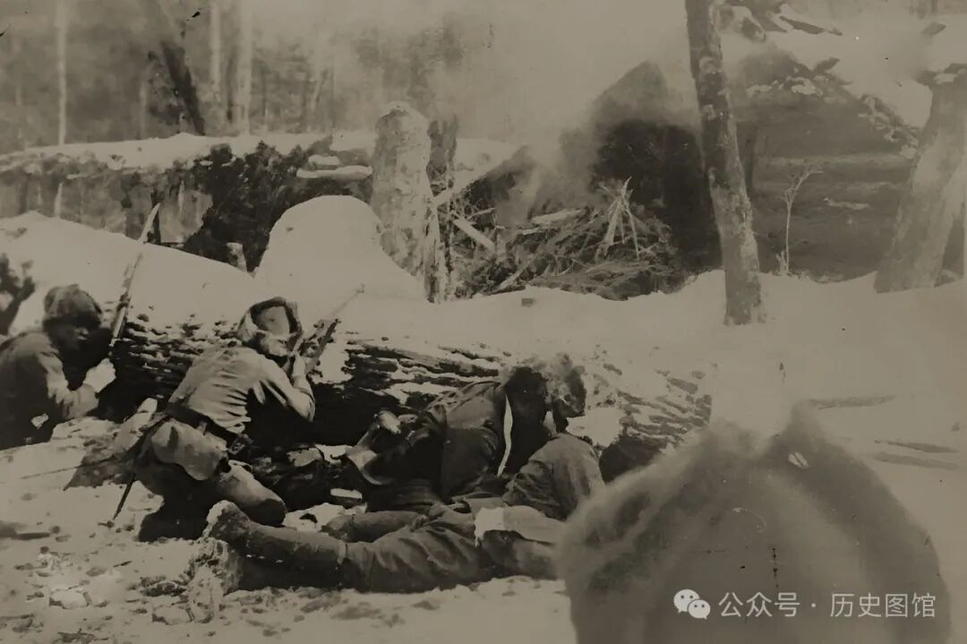在东北的林海雪原,几名日军正躲在树干后面,朝中国军队射击。对面中国军队的火力压制,使得几名日军趴在树干后面不敢露头。