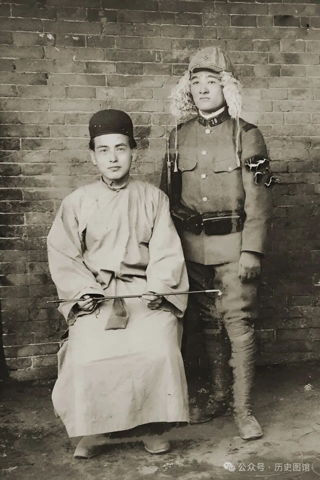 他换上中国人的服饰,手拿一根烟袋锅。看他拿烟袋锅的姿势以及脚上穿的日军军靴,暴露了他不是中国人。而站在他旁边的日军士兵,正是相册的主人,同样还是面无表情。