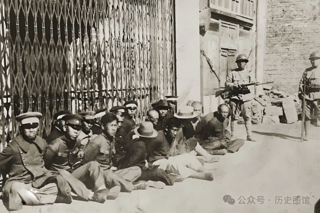 这张照片,拍摄于辽宁某地。日军抓住了几名抵抗的东北军士兵和游击队员。他们双手被缚坐在地上,旁边有几名日军士兵荷枪实弹。不知道这些被俘虏的中国士兵后来怎样了。