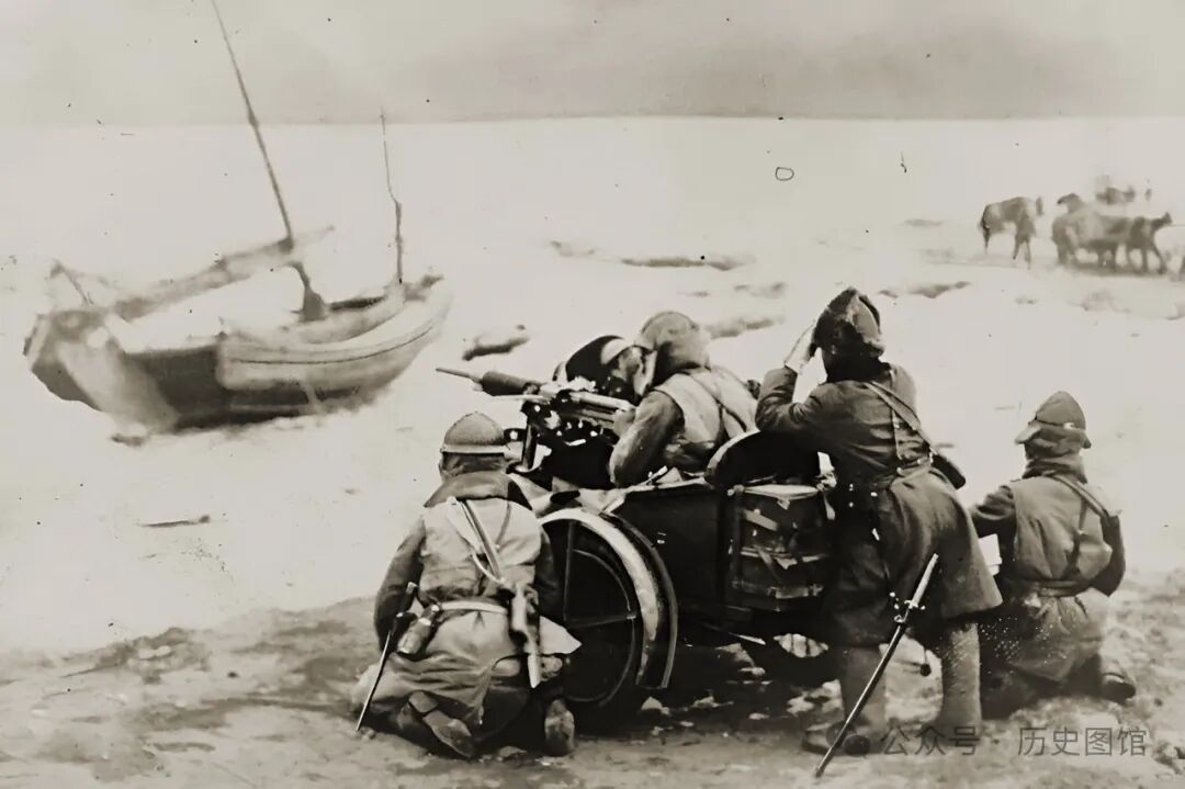 摩托车上,架着一挺重机枪,一名日军用望远镜观察着江面上的情况。不远处,还有马群在雪地上觅食。