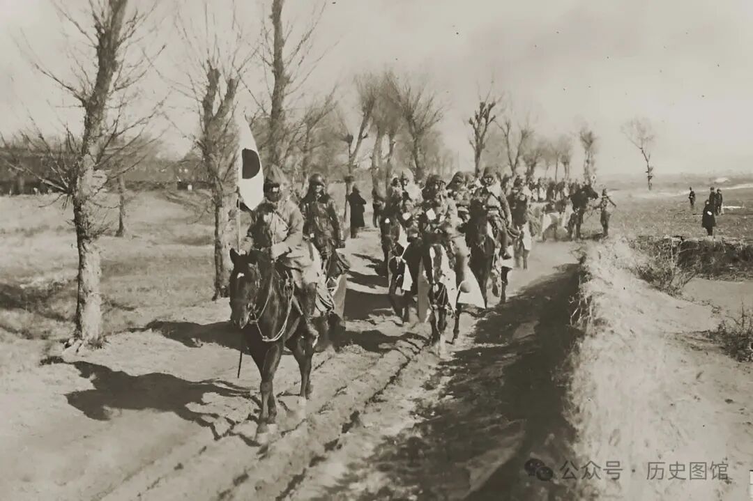 大路上,走来一支日军骑兵部队,不紧不慢大摇大摆,浩浩荡荡开赴前线。队伍一眼望不到尽头,为首一名日军举着旗子,耀武扬威。