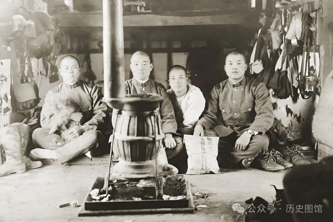 在日军营地,日军78联队的几名士兵正在休息。东北的天气异常寒冷,这些日军生起了煤炉取暖,其中一名日军还抱着一只小狗,真会享受。