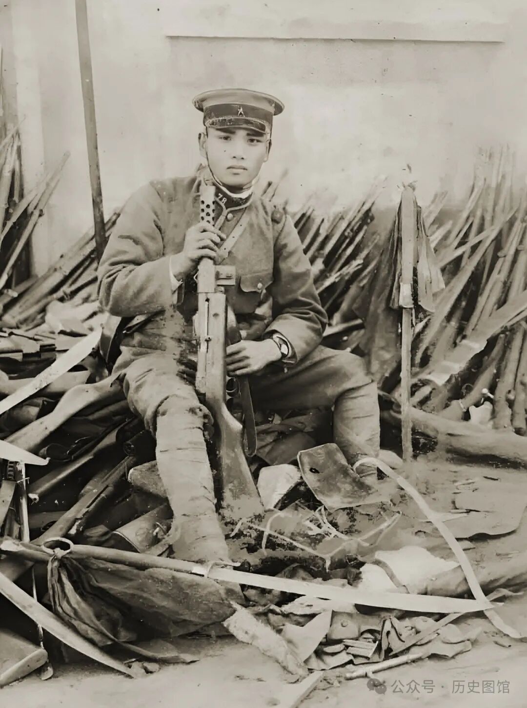 一名日军78连队士兵,坐在被缴获的东北军的武器前合影,他手里拿着一把冲锋枪——德国MP18冲锋枪,俗称“花机关”。