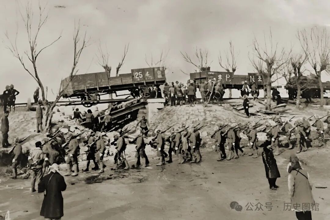 他们经常会偷袭日军的铁路运输线,毁掉铁路,炸毁列车。照片中,日军的一列火车和铁路桥被游击队摧毁。一群日军排着队从桥下的冰面上走过。