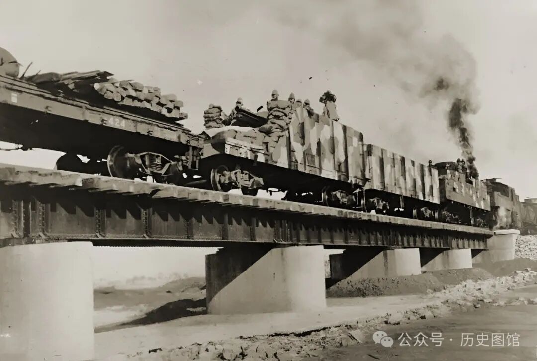 这是日军的一列九四式装甲列车,正在通过中国东北一座铁路桥,火车吐出长长的黑烟。