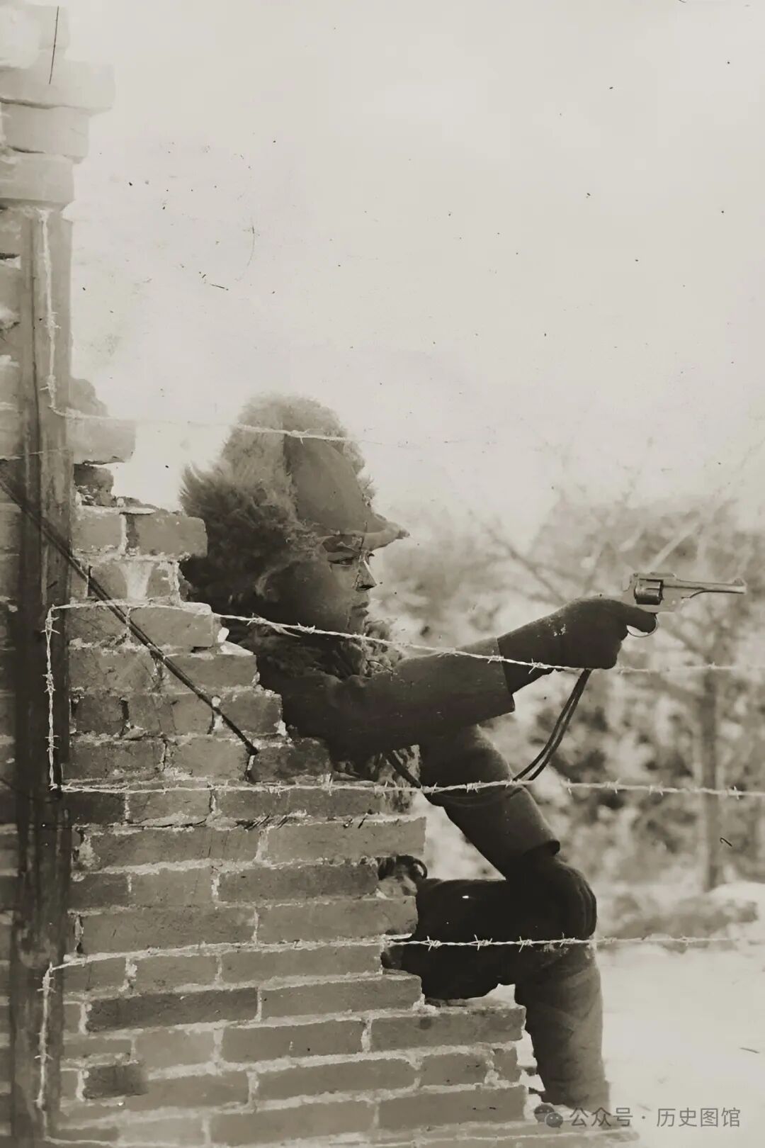 这是街边的一个哨卡,一名日军躲在铁丝网后面,手里举着一把左轮手枪,作出射击的动作。这种手枪在日军中比较少见,很有可能是从东北军手里缴获的。这名日军将这把枪作为自己的战利品。